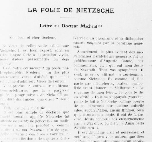 REMACLE Adrien, "La folie de Nietzsche: lettre au Docteur Michaut", in La Plume, 25, 1er décembre 1913, p. 237-239.