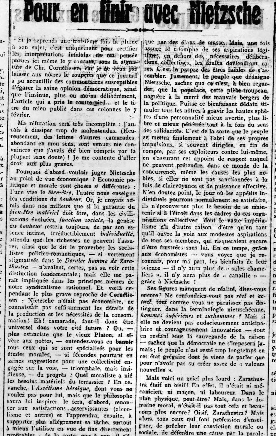 Suscite une vive réaction de Christian Cornélissen: "Nietzsche et la démocratie. Est-ce que les extrêmes se touchent?", in La Bataille Syndicaliste, 7 mars 1915, p. 3.