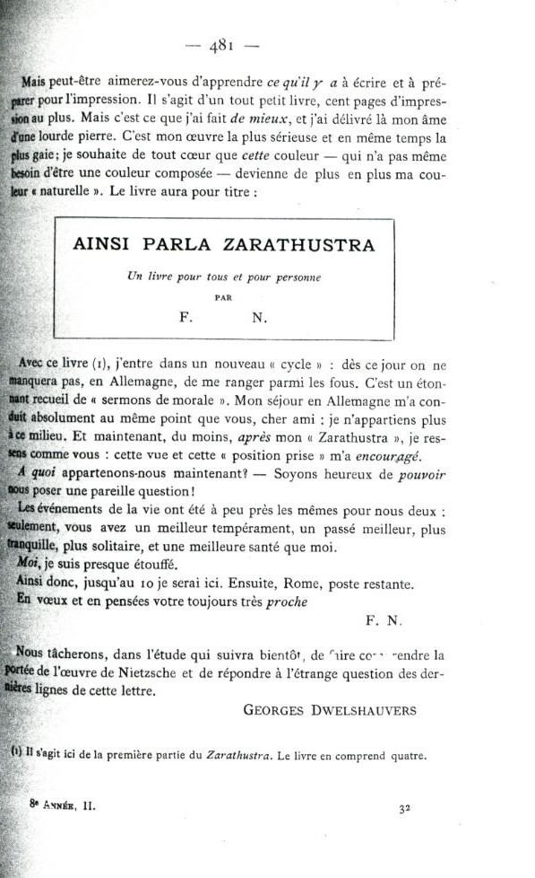 DWELSHAUVERS Georges, « Etudes sur Friedrich Nietzsche. I Introduction », in Société nouvelle, octobre 1892, p. 470-481.